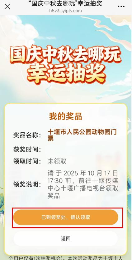 用户完成小游戏后,可自动获得1次抽奖资格(每名用户仅有一次抽奖机会),即有机会获得十堰市人民公园动物园门票1张,获奖者请于10月17日17:30前,到十堰传媒中心十堰广播电视台,展示“十堰广播电视台”微信视频号关注页面,现场核销后,领取门票。